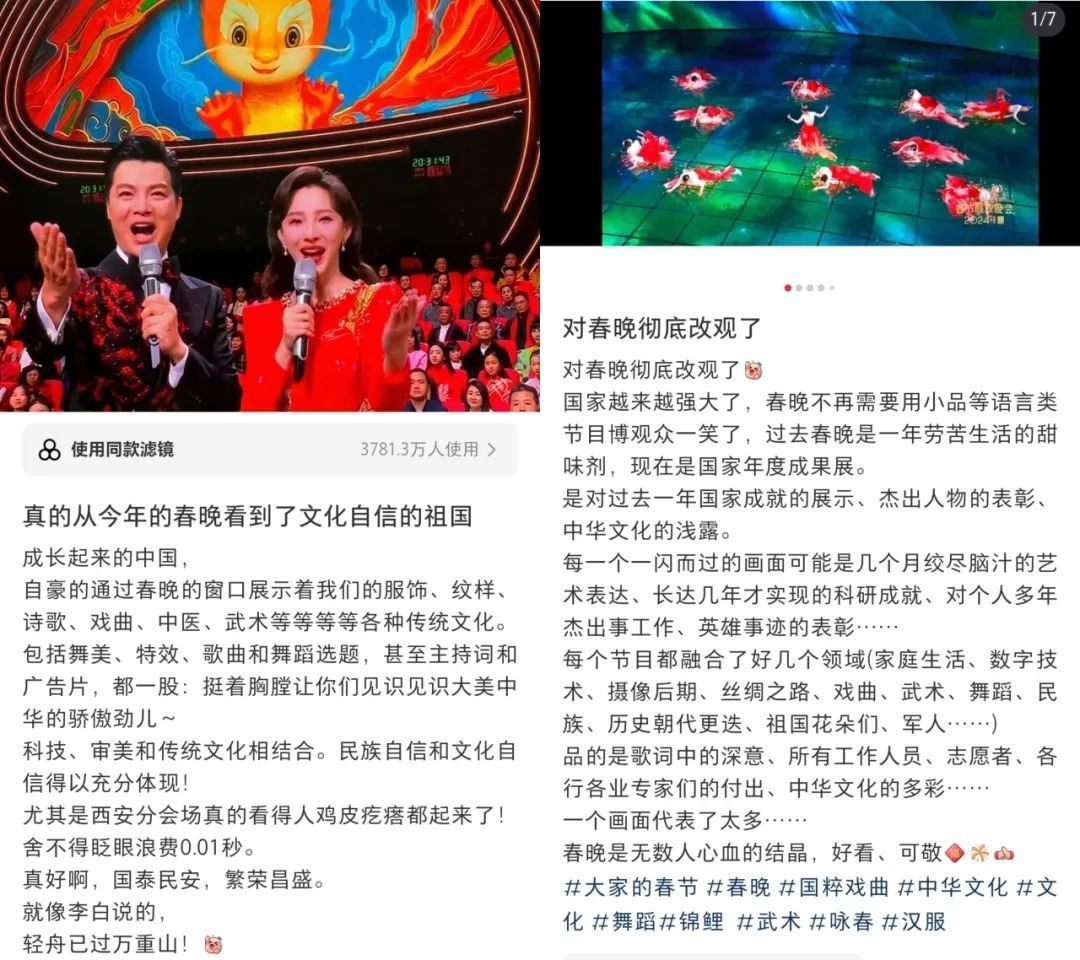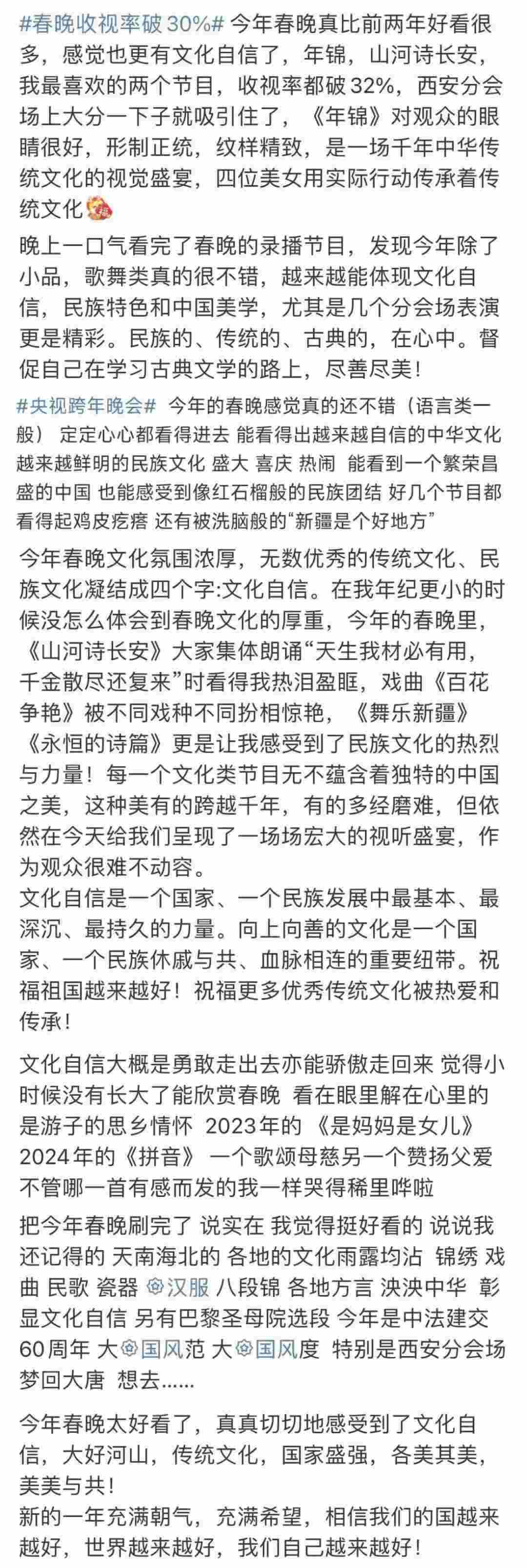 春晚的文化展現(xiàn),在國(guó)人中也引起了熱烈反響?!懊恳粋€(gè)文化類節(jié)目都蘊(yùn)含著獨(dú)特的中國(guó)之美,這種美有的跨越千年,有的多經(jīng)磨難,春晚給我們呈現(xiàn)了一場(chǎng)場(chǎng)宏大的視聽盛宴,作為觀眾很難不動(dòng)容”“從今年春晚真真切切地感受到了文化自信,大好河山,傳統(tǒng)文化,國(guó)家強(qiáng)盛,美美與共”“文化傳統(tǒng)特色給各個(gè)節(jié)目都刷了創(chuàng)意的漆,霸氣從節(jié)目中升騰,自信從感嘆中生發(fā),真妙”......
