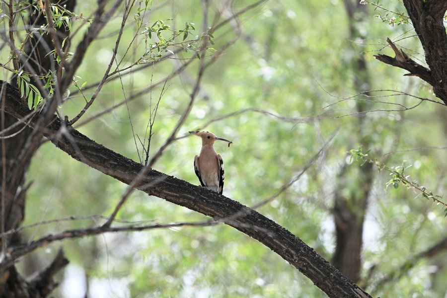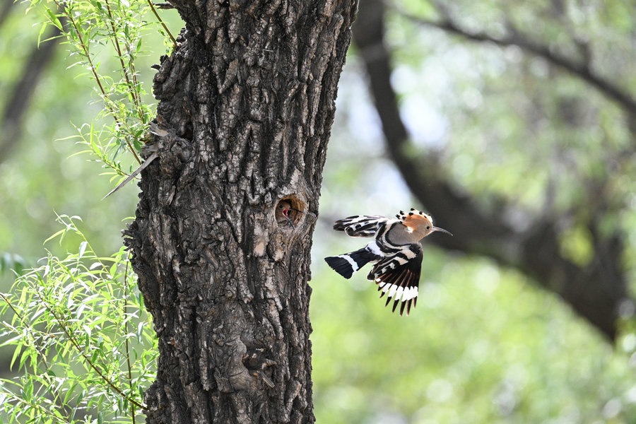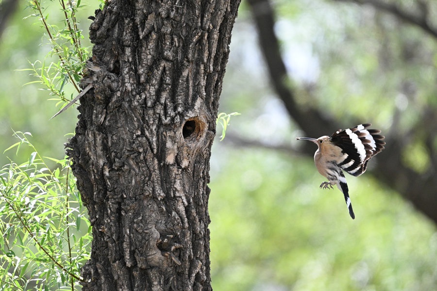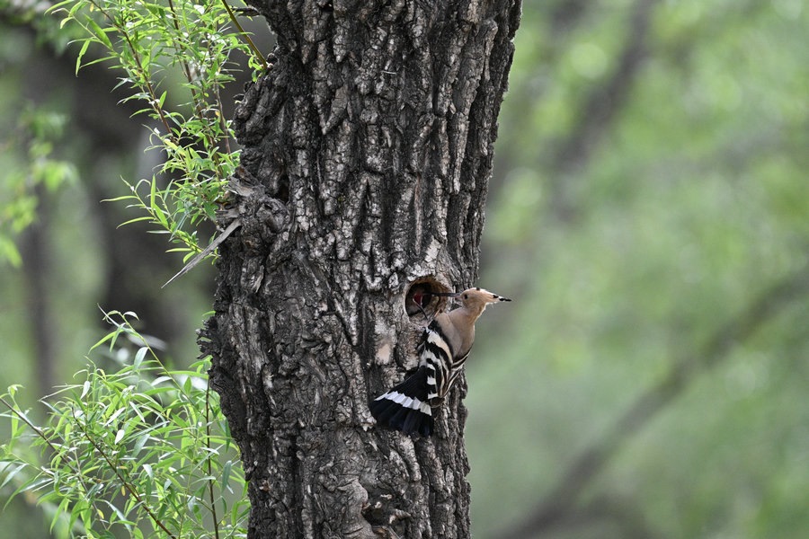 6月4日,呼和浩特市玉泉區(qū)大黑河沿岸,戴勝鳥在樹林、草叢中覓食,捉到蟲子飛回窩喂給鳥寶寶,3個(gè)小時(shí)內(nèi)往返數(shù)十次。吸引了眾多攝影愛好者前來(lái)拍攝。