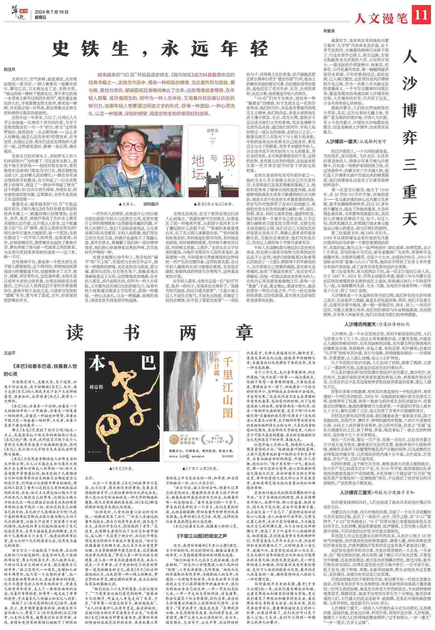 到過(guò)沙漠的人,一個(gè)共同的感受是,天際蒼茫,狂風(fēng)怒吼,飛沙走石。生活在沙漠邊緣的人,則要長(zhǎng)年累月地與沙漠搏斗,打的是一場(chǎng)維護(hù)家園的保衛(wèi)戰(zhàn)。在這場(chǎng)戰(zhàn)爭(zhēng)中,內(nèi)蒙古有三個(gè)關(guān)鍵人物,他們是人沙博弈大戰(zhàn)中苦練出來(lái)的精英模范,他們的事跡永遠(yuǎn)留在了沙漠變綠洲的傳說(shuō)中。