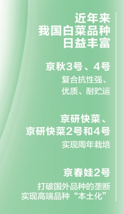 近年來,我國白菜育種實力突飛猛進(jìn),品種日益豐富,實現(xiàn)了從單一“秋播冬貯”向優(yōu)勢產(chǎn)區(qū)生產(chǎn)、產(chǎn)品多樣化和周年生產(chǎn)轉(zhuǎn)變。培育出了復(fù)合抗性強、優(yōu)質(zhì)、耐貯運的品種“京秋3號、4號”等,高品質(zhì)、速生苗用品種“京研快菜、京研快菜2號和4號”3個品種搭配實現(xiàn)了周年栽培,解決了生產(chǎn)上長期缺乏冬春和夏季栽培專用品種的難題。還育成了娃娃菜、快菜、紹菜、金絲白等高品質(zhì)品種,尤其是“京春娃2號”一舉打破國外品種的壟斷,它比國外品種早熟5至7天,種植密度高25%,畝收入增長30%,已成為國產(chǎn)娃娃菜第一大品種,實現(xiàn)了高端品種的“本土化”。