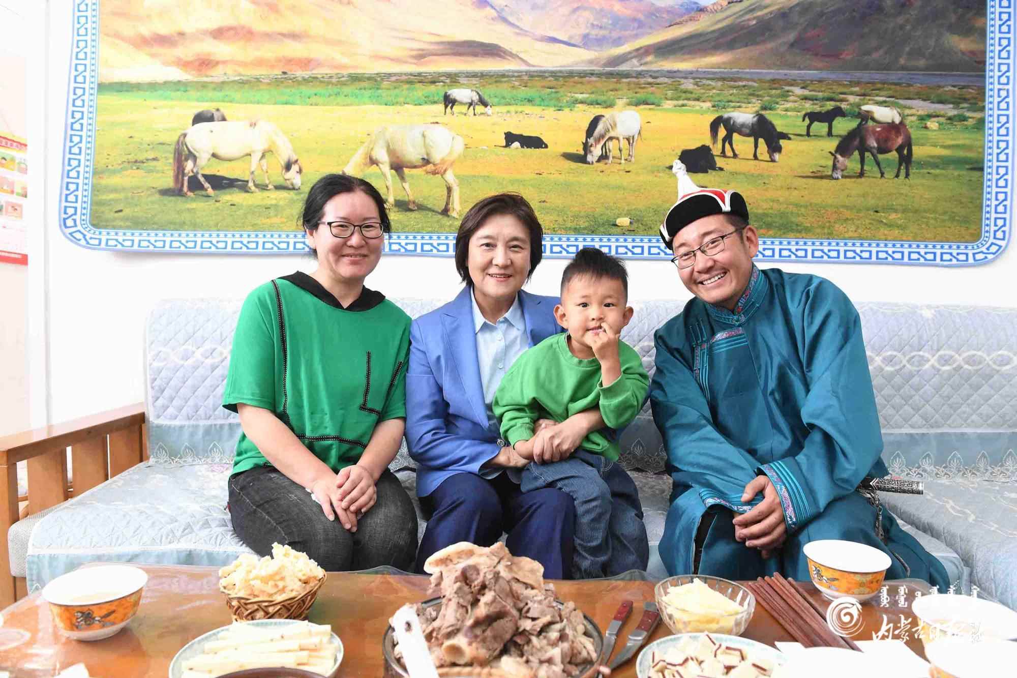6月8日,自治區(qū)黨委副書(shū)記、自治區(qū)主席布小林在巴彥淖爾市烏拉特中旗調(diào)研,她來(lái)到希日朝魯嘎查牧戶呼斯勒家走訪,并與他們一家合影留念。內(nèi)蒙古日?qǐng)?bào)社融媒體記者 韓卿立攝