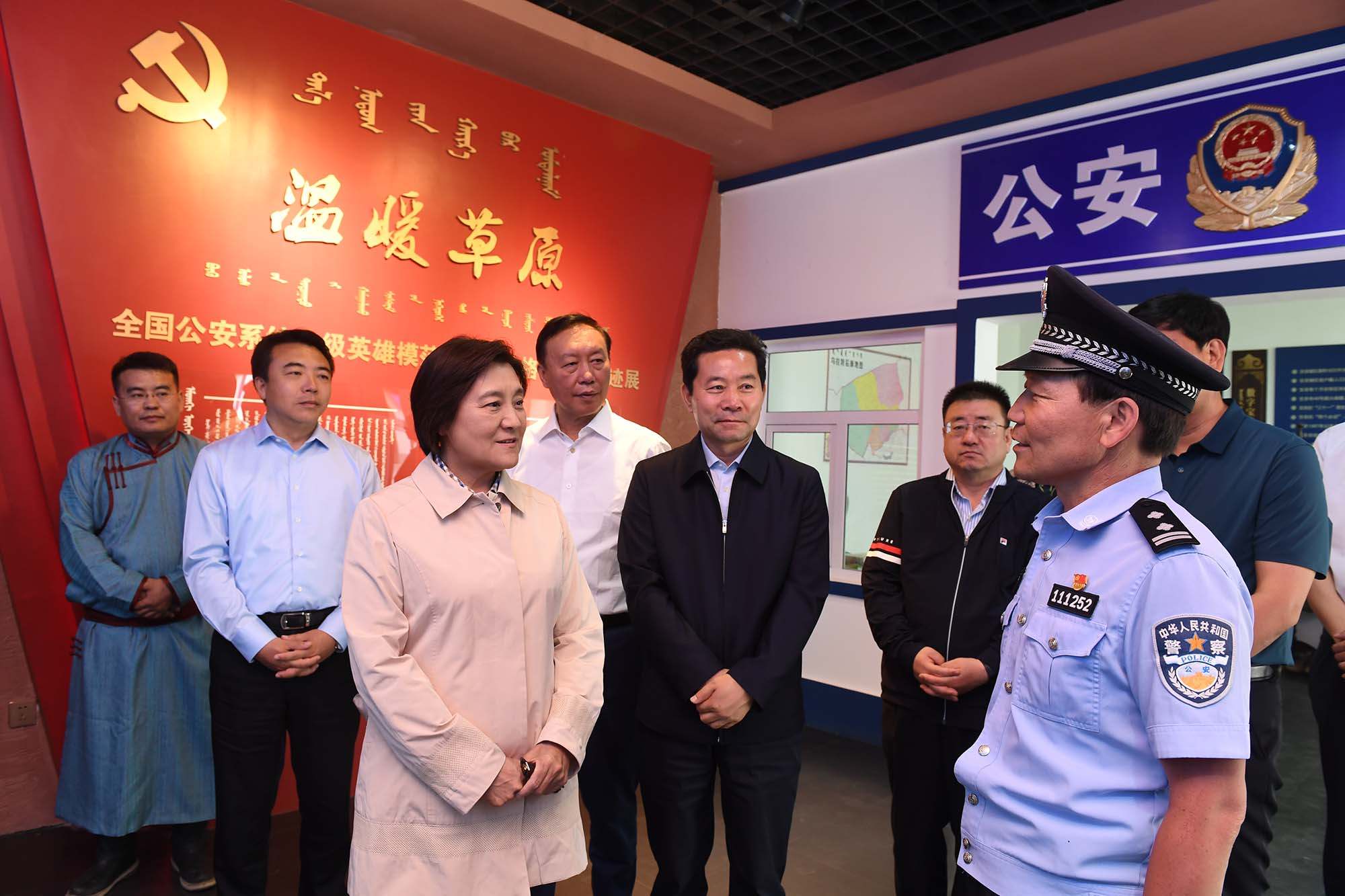 6月9日,自治區(qū)黨委副書(shū)記、自治區(qū)主席布小林來(lái)到巴彥淖爾市烏拉特后旗公安局潮格溫都爾鎮(zhèn)寶音德力格爾事跡館參觀,與寶音德力格爾親切交談。內(nèi)蒙古日?qǐng)?bào)社融媒體記者 韓卿立攝