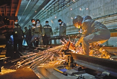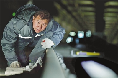 昏暗、逼仄的軌行區(qū)內(nèi),軌道檢修師們焊接鋼軌時(shí)迸發(fā)的火花顯得格外耀眼,維修軌道設(shè)備時(shí)敲擊鋼軌的聲音顯得格外清脆、響亮。據(jù)田智宏介紹,一個(gè)軌道檢修師每次夜間軌行區(qū)的巡檢作業(yè)大約要走7公里路程。他和工友們每天要檢查數(shù)千個(gè)部件,測量上百個(gè)數(shù)據(jù),其中一項(xiàng)重要巡檢工作就是檢查扣件和接頭聯(lián)結(jié)零件的組成部件是否安裝牢固,螺栓是否松動(dòng)。他指了指自己腳上的鞋說:“我們的檢修對象不僅笨重且危險(xiǎn)性較高,為了防止腳部受到傷害,鞋子都是特制的防砸絕緣鞋。”