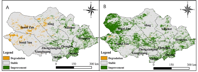 渾善達(dá)克沙地植被質(zhì)量變化空間分異參考基線(A)與現(xiàn)狀(B) 。圖源:中國林科院荒漠化研究所