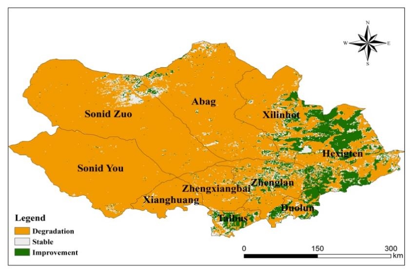 隨著國家生態(tài)恢復(fù)工程的啟動,渾善達(dá)克沙地未出現(xiàn)新的生態(tài)質(zhì)量退化區(qū)域,目前生態(tài)系統(tǒng)質(zhì)量提高區(qū)域占沙地五分之一,主要分布在東部。