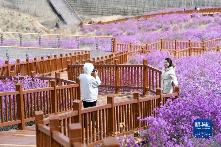 4月27日,游人在內(nèi)蒙古自治區(qū)呼倫貝爾市扎蘭屯市一處杜鵑坡拍照。新華社記者貝赫攝