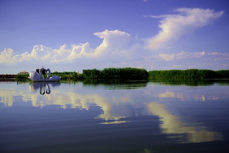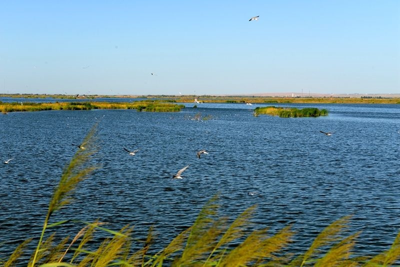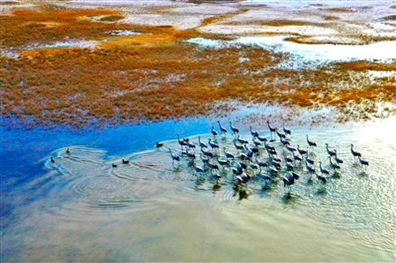 烏蘭布和沙漠境內(nèi)的天鵝湖濕地上候鳥(niǎo)飛翔