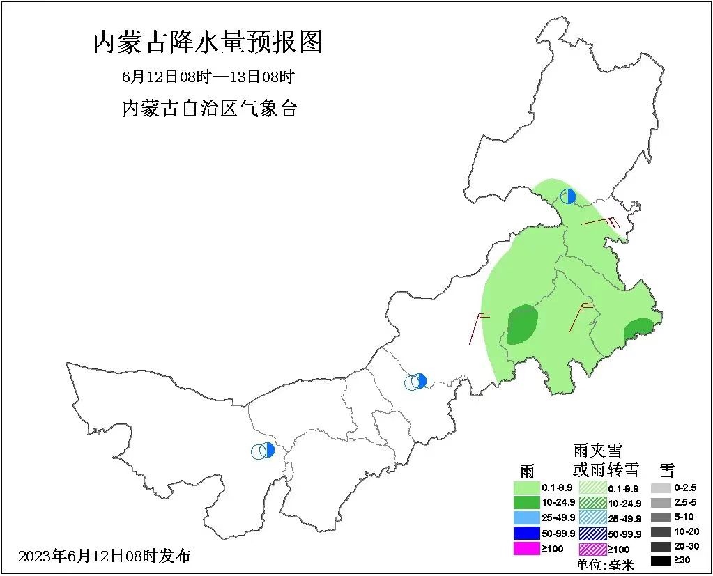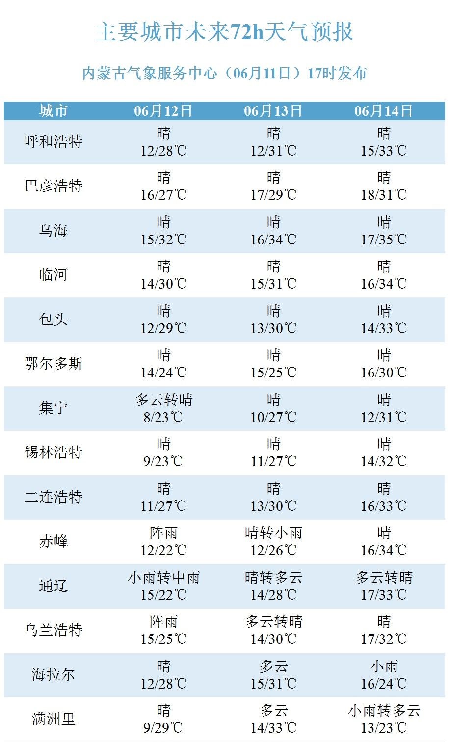 具體天氣預報為:12日白天到夜間,內蒙古中部偏東和東部大部地區(qū)多云,其中,錫林郭勒盟東部、赤峰市、通遼市、興安盟大部、呼倫貝爾市南部部分地區(qū)有小雨或雷陣雨,上述地區(qū)可能伴有短時強降水、雷暴大風等強對流天氣,其余地區(qū)晴間多云;內蒙古西部偏西和中部偏東地區(qū)4~5級東南風或偏北風;阿拉善盟西北部局地有35℃以上的高溫天氣。