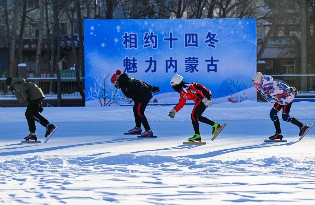 1月18日,呼倫貝爾市海拉爾區(qū)第七中學(xué)的學(xué)生們?cè)谛@里滑冰。新華社記者 劉磊 攝