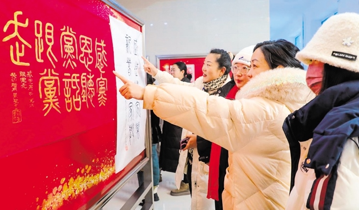 各類參展作品掛在以紅色為底的展板上,新年的氛圍感瞬間拉滿?!芭e辦這次活動特別有意義,真的很喜歡這種文化氛圍?!眱?nèi)蒙古自治區(qū)第八屆道德模范獲得者鄭洪山邊看邊說。