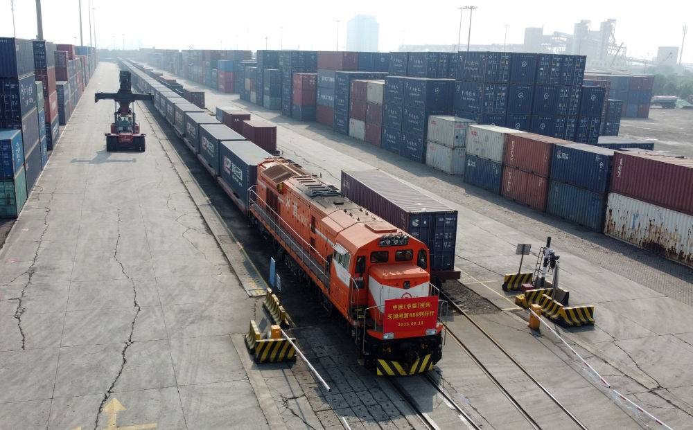 2023年9月18日,一列發(fā)往蒙古國(guó)烏蘭巴托的中歐(中亞)班列駛出天津港物捷三堆場(chǎng)(無人機(jī)照片)。