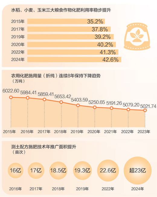 2024年,我國水稻、小麥、玉米三大糧食作物化肥利用率為42.6%,比2022年提高1.3個百分點?;世寐剩椿时蛔魑镂绽玫谋壤?,反映了化肥在農(nóng)業(yè)生產(chǎn)中的有效利用程度??茖W施肥效果提升,折射農(nóng)業(yè)發(fā)展方式之變。
