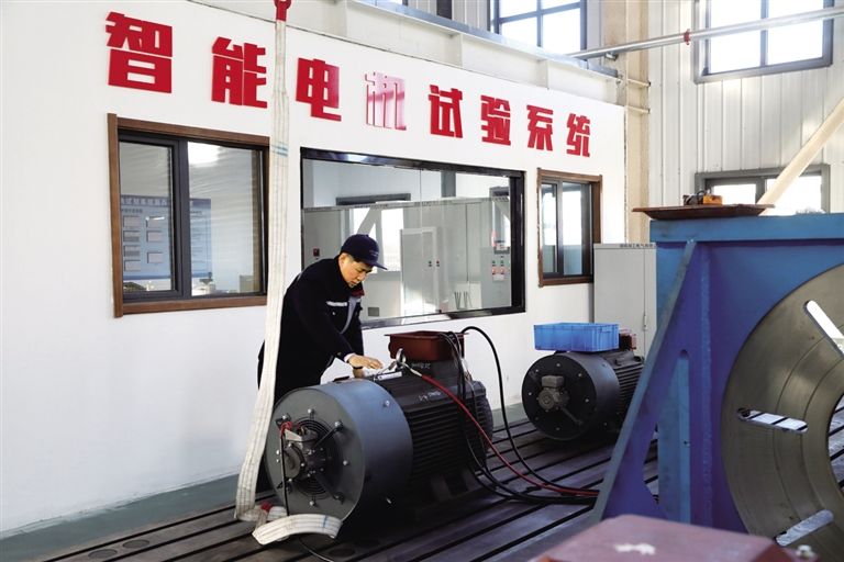 內(nèi)蒙古優(yōu)普森電氣有限公司生產(chǎn)車間內(nèi)一臺永磁電機正在進行出廠前試驗。 記者 劉向平 攝