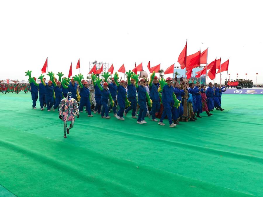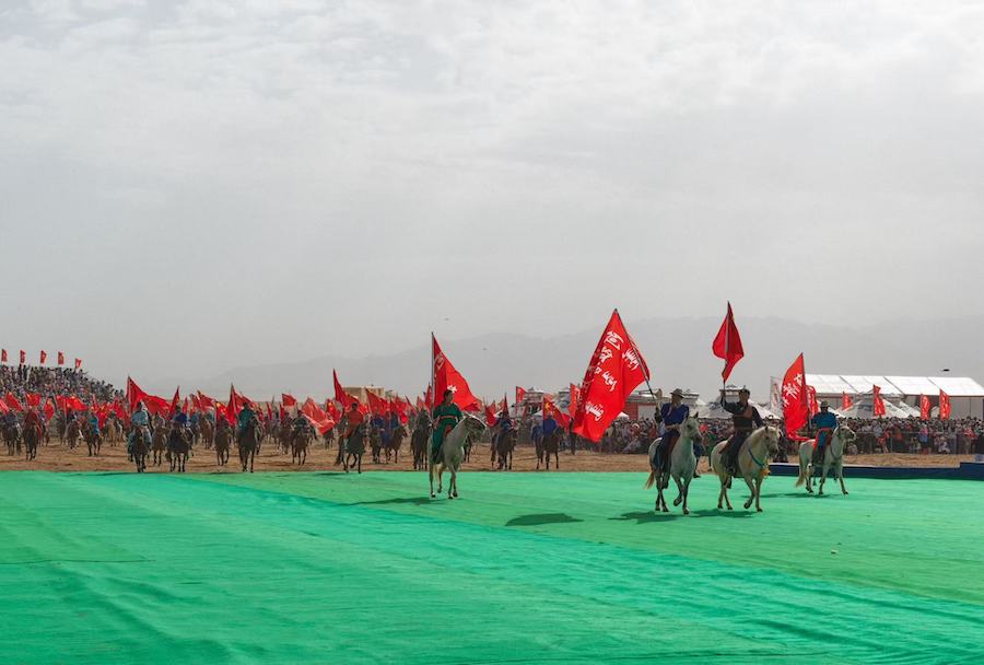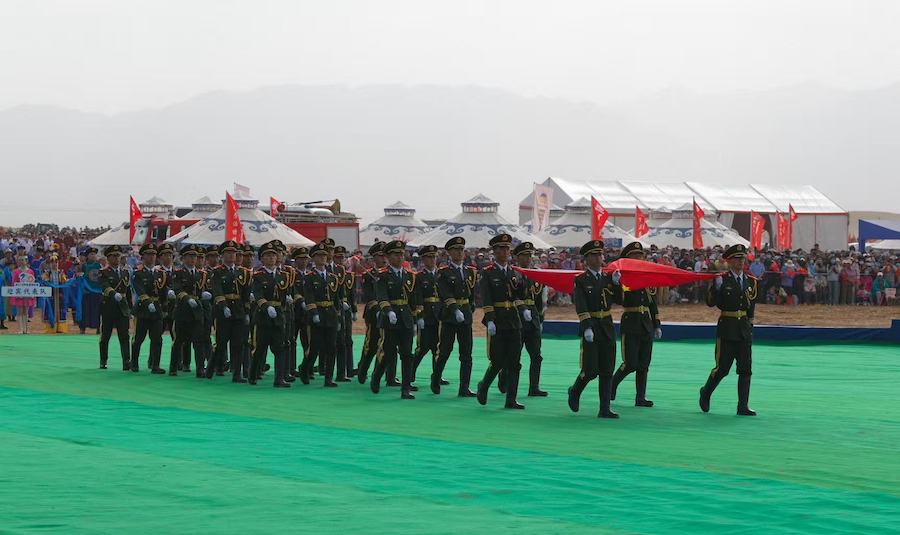 2025阿拉善那達(dá)慕開(kāi)幕式上儀仗隊(duì)護(hù)送國(guó)旗走向場(chǎng)地