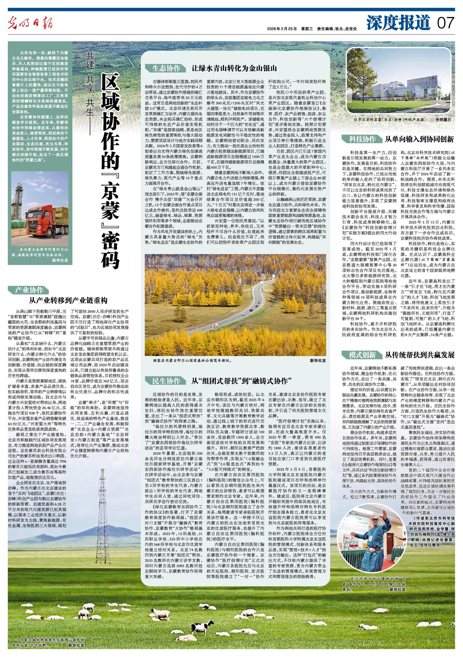 2026年2月25日《光明日報》第7版整版刊發(fā)了《共建、共享、共生——區(qū)域協(xié)作的“京蒙”密碼》的文章,報道了聚焦民生福祉,夯實(shí)協(xié)作根基。京蒙協(xié)作始終將保障和改善民生作為出發(fā)點(diǎn)和落腳點(diǎn),通過精準(zhǔn)對接群眾需求,推動優(yōu)質(zhì)資源對接、共享,努力提升人民的幸福感、獲得感,通過改善民生凝聚人心。