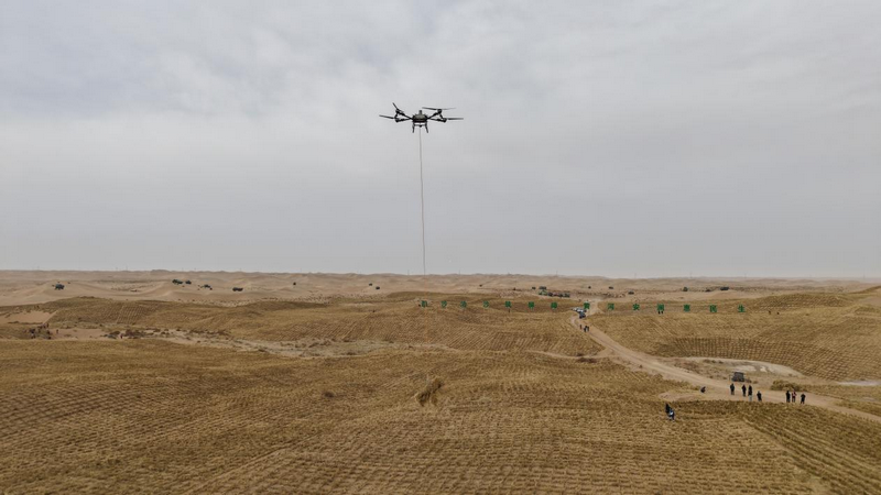 當日上午10時,在黃河“幾字彎”西岸的項目現場,工程車輛整齊列隊蓄勢待發(fā),治沙工作者與建設人員精神抖擻,處處涌動著起步即沖刺、實干勇爭先的奮斗熱潮。隨著響亮的“開工”令下,現場機械轟鳴,打樁機精準作業(yè),無人機吊運草料,手扶式沙障機忙著扎設草方格……阿拉善盟“十五五”時期生態(tài)建設的首場戰(zhàn)役——2026年“三北”六期工程攻堅戰(zhàn)全面打響。