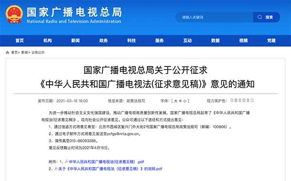3月16日,國(guó)家廣播電視總局發(fā)布《中華人民共和國(guó)廣播電視法(征求意見(jiàn)稿)》(以下簡(jiǎn)稱“征求意見(jiàn)稿”),向社會(huì)公開(kāi)征求意見(jiàn)。征求意見(jiàn)稿分為總則、業(yè)務(wù)準(zhǔn)入、制作播放、傳輸覆蓋、公共服務(wù)、扶持促進(jìn)、安全保障、監(jiān)督管理、法律責(zé)任和附則,共10章80條。意見(jiàn)反饋截止日期為2021年4月16日。