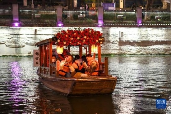 在四川省成都市“夜游錦江”游覽河段,工作人員在游船上與乘客互動(3月1日攝)。