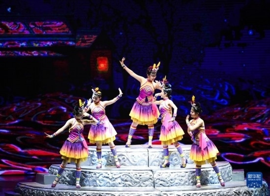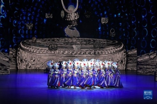 6月5日,演員在貴陽(yáng)大劇院的《多彩貴州風(fēng)》演出中表演節(jié)目《踩鼓舞》。
