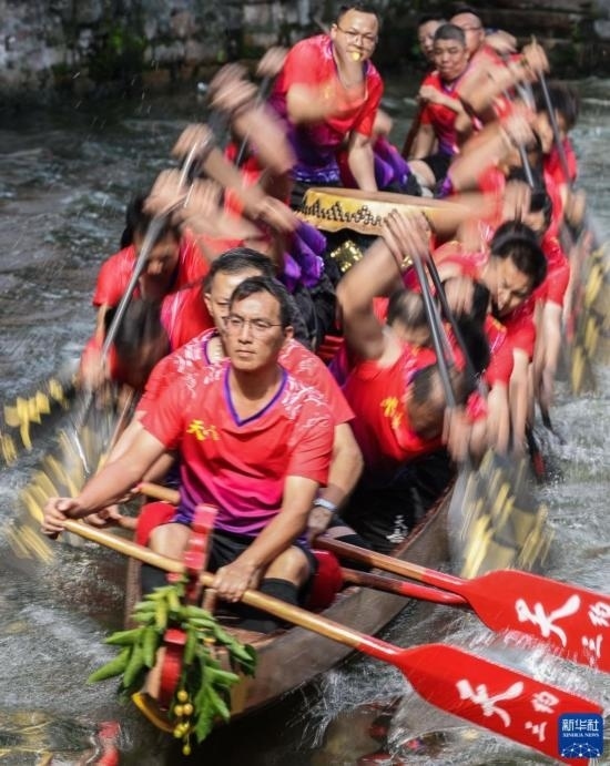 龍船漂移時(shí),船頭船尾的舵手專門負(fù)責(zé)入彎出彎時(shí)的線路和速度控制(6月22日攝)。