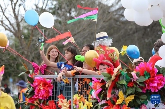 這是9月23日在新西蘭黑斯廷斯拍攝的“迎春花車巡游日”活動(dòng)現(xiàn)場。