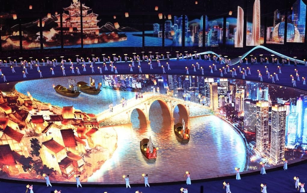 開幕式現(xiàn)場出現(xiàn)了杭州拱宸橋的形象。始建于1631年的拱宸橋,是京杭大運河南端的標志性建筑。2014年6月,中國大運河成功申報世界文化遺產(chǎn),拱宸橋作為運河水工建筑,成為一處遺產(chǎn)點。