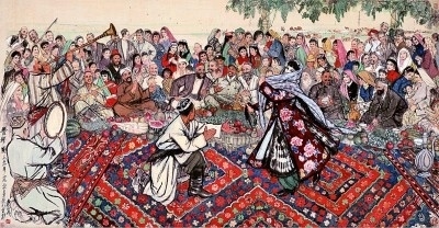 繞過紅色展墻,黃胄于1962年創(chuàng)作的《豐樂圖》赫然在目,拉開了展覽第一篇章的序幕。花團錦簇的地毯上擺滿瓜果,人們圍坐在一起載歌載舞,歡慶豐收。畫面中的眾多人物雖姿態(tài)各異,但都喜笑顏開,感染著觀者。作品描繪出熱烈的慶祝場面,富有濃郁的地域特色,是新疆各族人民團結(jié)和睦、意氣風發(fā)的生動寫照。