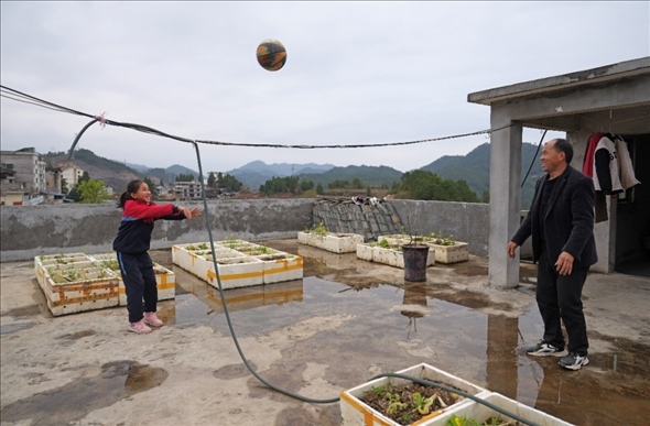 3月27日,李文文在屋頂露臺和父親玩投籃游戲。李文文是貴州臺江縣臺盤鄉(xiāng)中心小學(xué)的女籃隊長,以前他的父親在外地務(wù)工,如今火爆全網(wǎng)的“美麗鄉(xiāng)村”籃球聯(lián)賽給臺盤鄉(xiāng)帶來了人氣,父親在家門口就能找到工作。
