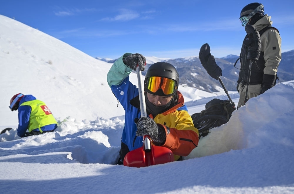 彭超(中)和新疆阿勒泰地區(qū)禾木吉克普林滑雪場救援隊一起做雪層分析,預(yù)判風(fēng)險保障游客滑行安全。