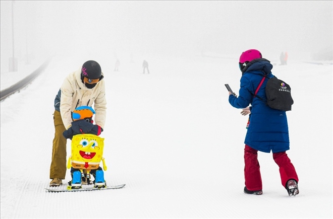 在新疆白云國際滑雪場,許秀娟(右)在給愛人和兒子拍照。哈爾濱人許秀娟曾是專業(yè)運動員,代表國家隊拿過國際大賽獎牌。退役后她來到新疆,在這里她和愛人相識,一起開辦培訓(xùn)機構(gòu),面向青少年推廣冰雪運動。