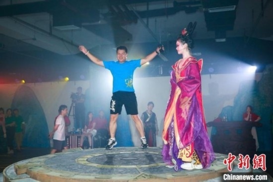 《猴王問世》導(dǎo)演郝博介紹,這部戲提煉《山海經(jīng)》背景而創(chuàng)作,以金、水、木、火、土五行相生的順序,對(duì)應(yīng)白、藍(lán)、綠、紅、黃五個(gè)顏色,以及悲、恐、怒、喜、思五種情緒,與此相應(yīng)還有“后羿射日”“大禹治水”“刑天斷首”“夸父逐日”“女媧補(bǔ)天”五段神話故事?!爱?dāng)下年輕人的生活節(jié)奏快、壓力大,我們希望觀眾成為‘玩家’,通過‘參演’音樂劇《猴王問世》,釋放壓力,丟掉情緒垃圾?!焙虏┱f。