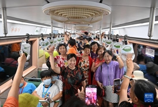 從8月8日起,北京地鐵一號線開行“時(shí)光列車”,6節(jié)車廂采用不同時(shí)代涂裝風(fēng)格。特別是綠色座椅、車廂頂部風(fēng)扇等元素,帶領(lǐng)乘客瞬間“穿越”,吸引人們紛紛打卡拍照?!皶r(shí)光列車”運(yùn)行時(shí)間是工作日14點(diǎn)至15點(diǎn),運(yùn)行區(qū)間是地鐵古城站至地鐵復(fù)興門站。