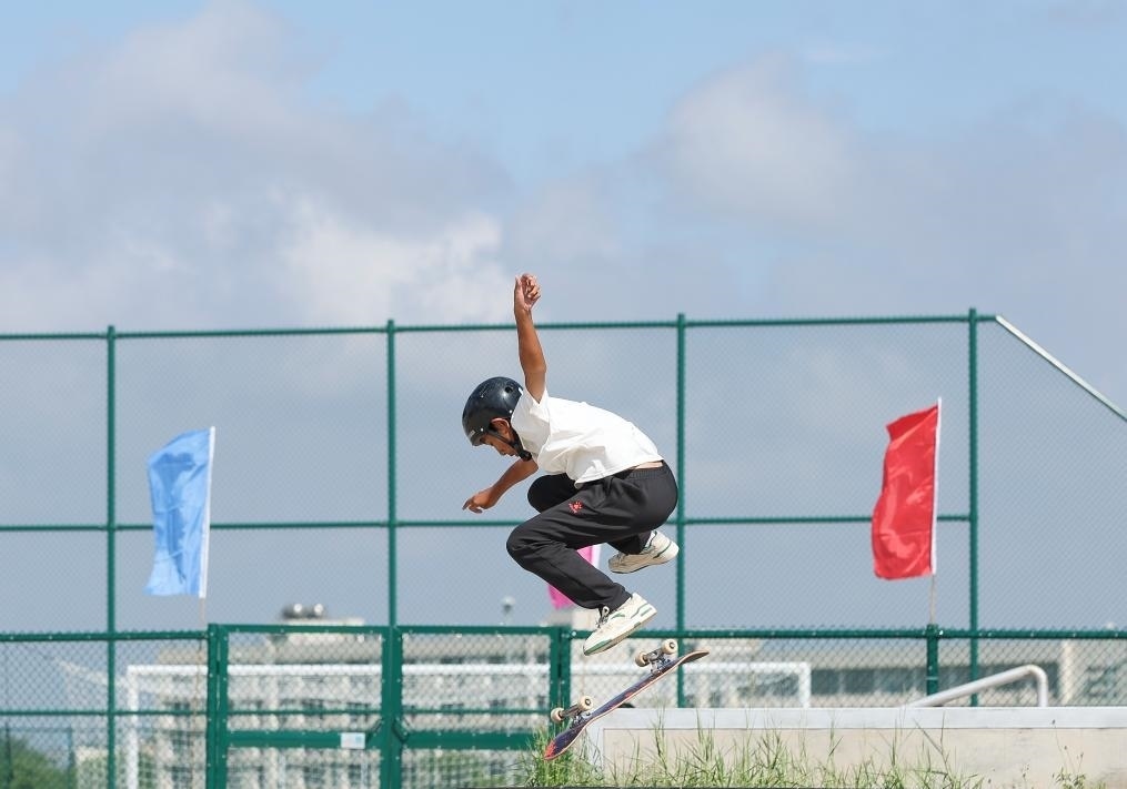 11月4日,武漢市選手詹何在第一屆全國學生(青年)運動會滑板男子街式決賽中奪冠。新華社記者 胡星宇 攝