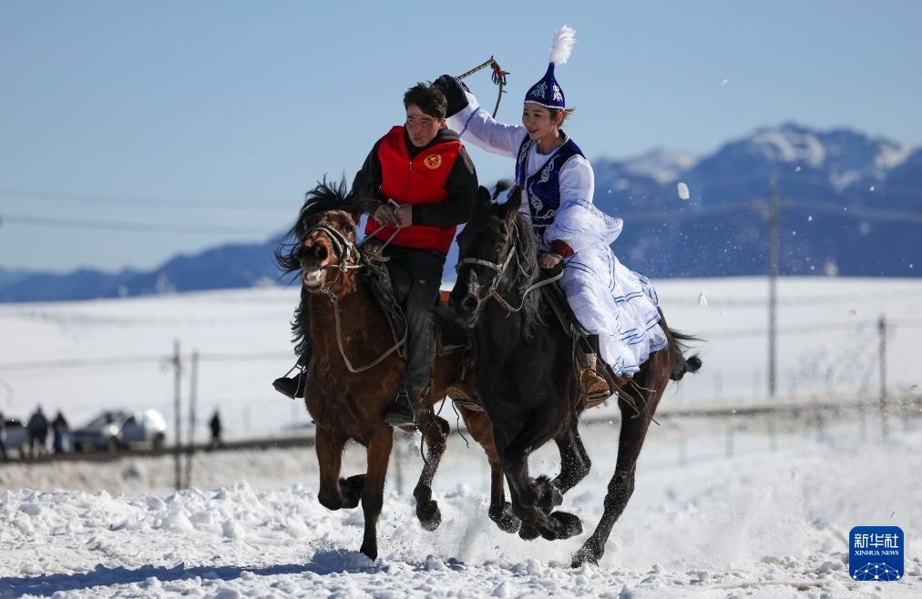 農(nóng)歷大年初二,新疆烏魯木齊縣“春節(jié)八天樂”系列活動——傳統(tǒng)體育民俗鬧新春在甘溝鄉(xiāng)進行。村民們在冰雪覆蓋的烏拉斯臺草原上進行雪地賽馬、“姑娘追”、馬上拾銀、叼羊等比賽,歡度新春。