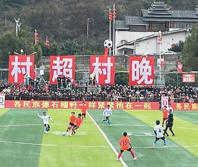 “村超”是指由當(dāng)?shù)厝罕娮詣?chuàng)舉辦的“貴州榕江(三寶侗寨)和美鄉(xiāng)村足球超級聯(lián)賽”。2023年初,文化和旅游部下發(fā)文件,鼓勵(lì)各地開展“四季村晚”活動(dòng)。
