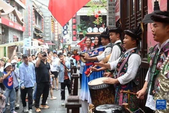 4月13日,演員在廣西南寧市三街兩巷表演節(jié)目。