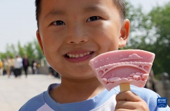 一名小朋友展示父母給買的趙州橋文創(chuàng)雪糕(4月25日攝)。新華社記者 王毓國(guó) 攝