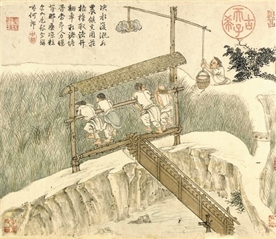 通過(guò)品讀繪畫中的水利機(jī)具發(fā)展變化,不僅可以直觀感受勞動(dòng)技術(shù)的進(jìn)步,還有助于從古人識(shí)水、用水的智慧中汲取養(yǎng)分。