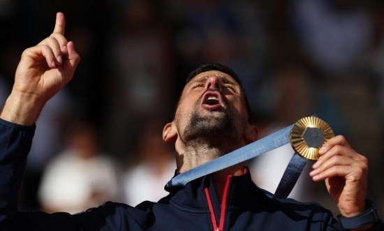 8月4日,焦科維奇在頒獎儀式上慶祝。當(dāng)日,巴黎奧運會網(wǎng)球項目男單決賽在羅蘭·加洛斯體育場舉行,塞爾維亞選手焦科維奇2比0戰(zhàn)勝西班牙選手阿爾卡拉斯,獲得冠軍。 新華社記者 高靜 攝