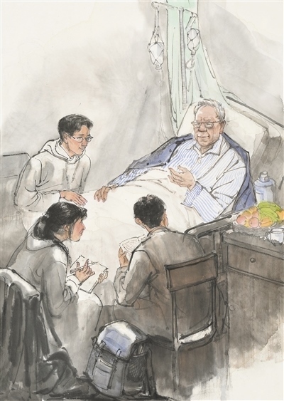 人民教師勤學(xué)篤行、求是創(chuàng)新的躬耕態(tài)度,給無(wú)數(shù)人以榜樣的力量,也給美術(shù)創(chuàng)作以靈感?!叭嗣窠逃摇眹?guó)家榮譽(yù)稱號(hào)獲得者衛(wèi)興華,終其一生都奮斗在勤學(xué)求真的道路上。90余歲時(shí),即使病痛纏身,他仍堅(jiān)持每天學(xué)習(xí)、工作。有感于衛(wèi)興華教授的敬業(yè)精神,高毅特意描繪了臥病在床的衛(wèi)興華堅(jiān)持與學(xué)生探討學(xué)術(shù)課題的場(chǎng)景,主人公那專注的神情令人動(dòng)容。像衛(wèi)興華這樣堅(jiān)守耕耘的教師還有許多。劉昌明水彩畫(huà)《一個(gè)教師的工作臺(tái)》便以細(xì)致的場(chǎng)景描繪表達(dá)出對(duì)教師群體的敬意。貼著泛黃舊紙的墻面、藥瓶和墨水瓶之間的教案、脫漆的木桌、一副老花眼鏡……畫(huà)家在此調(diào)動(dòng)了一切能夠反映老一輩教育者辛勤伏案的元素,象征著沒(méi)有直接出場(chǎng)的教師形象?!按颂師o(wú)聲勝有聲”的表達(dá)效果,令人回味無(wú)窮。