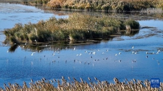 10月14日在居延海景區(qū)拍攝的水鳥(無(wú)人機(jī)照片)。