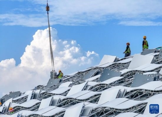 10月16日,中建深裝施工人員在深圳市體育中心專業(yè)足球場屋頂?shù)跹b幕墻材料(無人機(jī)照片)。