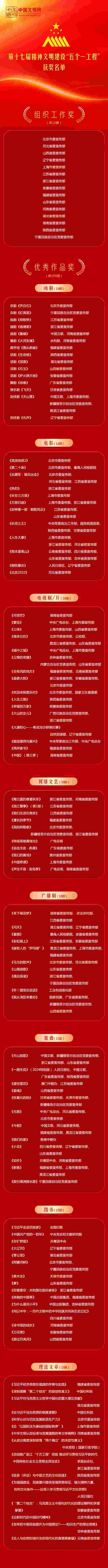 近日,中共中央宣傳部印發(fā)表彰決定,對第十七屆精神文明建設(shè)“五個一工程”組織工作先進單位和優(yōu)秀作品進行表彰。授予《齊白石》等15部戲劇作品、《流浪地球2》等12部電影作品、《問蒼?!返?6部電視作品、《陶三圓的春夏秋冬》等10部網(wǎng)絡(luò)文藝作品、《禾下乘涼夢》等10部廣播劇、《天山放歌》等12首歌曲,共105部作品“優(yōu)秀作品獎”;授予北京、河北、山西、遼寧、上海、江蘇、浙江、安徽、福建、山東、河南、湖北、湖南、陜西、寧夏等15個省區(qū)市黨委宣傳部“組織工作獎”。