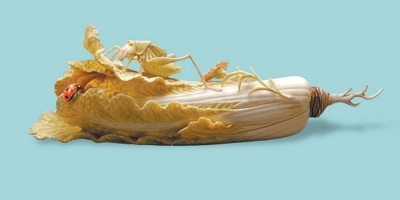 細(xì)細(xì)端詳,白菜葉莖上,還飾有兩朵小花,一朵含苞,一朵盛放;菜葉與主體的結(jié)合部位,趴伏著一只翠色蟈蟈,蟈蟈雙腿一屈一蹬,正盡情吮吸白菜鮮美的汁水;一只瓢蟲(chóng)一旁靜臥,須角隱現(xiàn),似乎也在埋頭享用大餐。小花和小蟲(chóng)的點(diǎn)綴,使得整個(gè)作品兼顧野趣和雅致,充滿生命的律動(dòng)與自然的和諧。