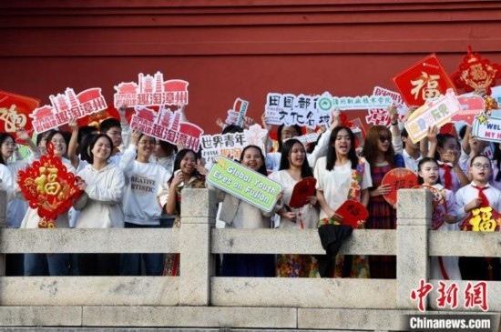圖為中外青年揮舞手中的中國結(jié)、“?!弊?、手牌等,表達(dá)此行的歡樂和美好。中新社記者 王東明 攝