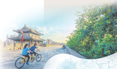 游客在陜西西安城墻上騎行。