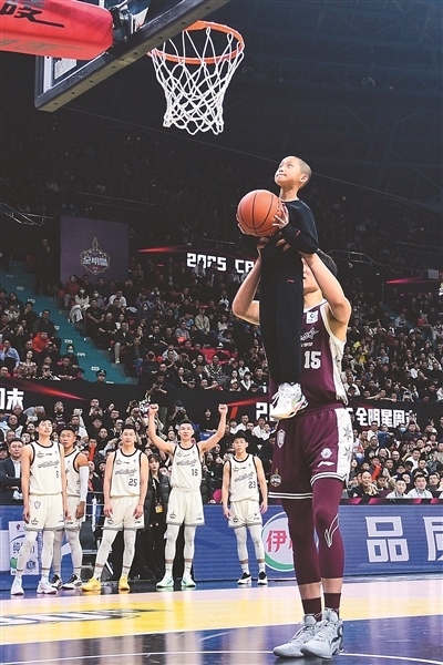 本屆全明星賽第二節(jié)最后的一次暫停時(shí),現(xiàn)場(chǎng)上演了溫情一幕:北區(qū)明星隊(duì)首發(fā)中鋒楊瀚森,舉起來(lái)自吉林省孤兒學(xué)校的小朋友趙路健,幫助他完成了一次扣籃。