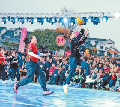 場(chǎng)上,身著特色服飾的婦女們或懷抱籃球健步如飛,或三五成群笑鬧爭(zhēng)球;場(chǎng)邊,蘆笙悠揚(yáng),錦雞舞、銅鼓舞輪番上陣,十二道攔門(mén)酒的醇香與觀眾的喝彩匯成獨(dú)特的苗味交響。傳統(tǒng)頭帕與運(yùn)動(dòng)發(fā)帶相得益彰,古法藍(lán)染與熒光記分屏互相映襯,這場(chǎng)縣城里的活力賽事,流淌著千年苗韻,躍動(dòng)著時(shí)代脈搏。