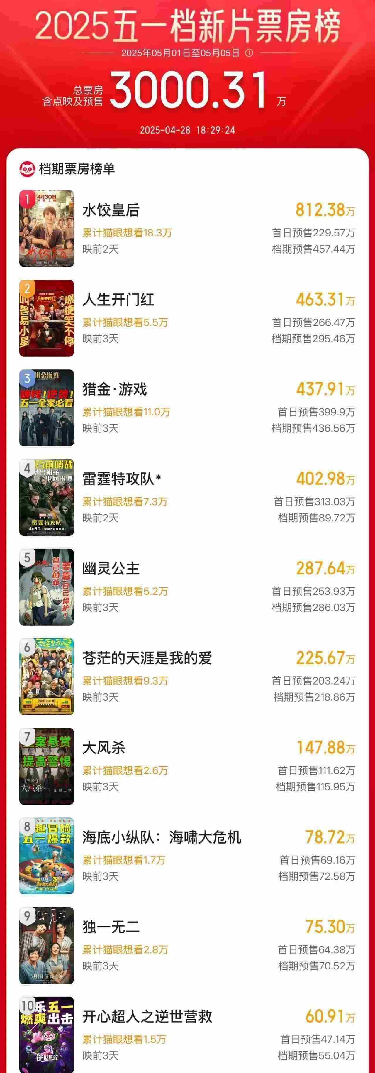 據(jù)網(wǎng)絡(luò)平臺(tái)數(shù)據(jù),截至4月28日18時(shí)29分,2025年“五一”檔新片預(yù)售總票房破3000萬(wàn),《水餃皇后》《人生開門紅》《獵金·游戲》分列前三位。