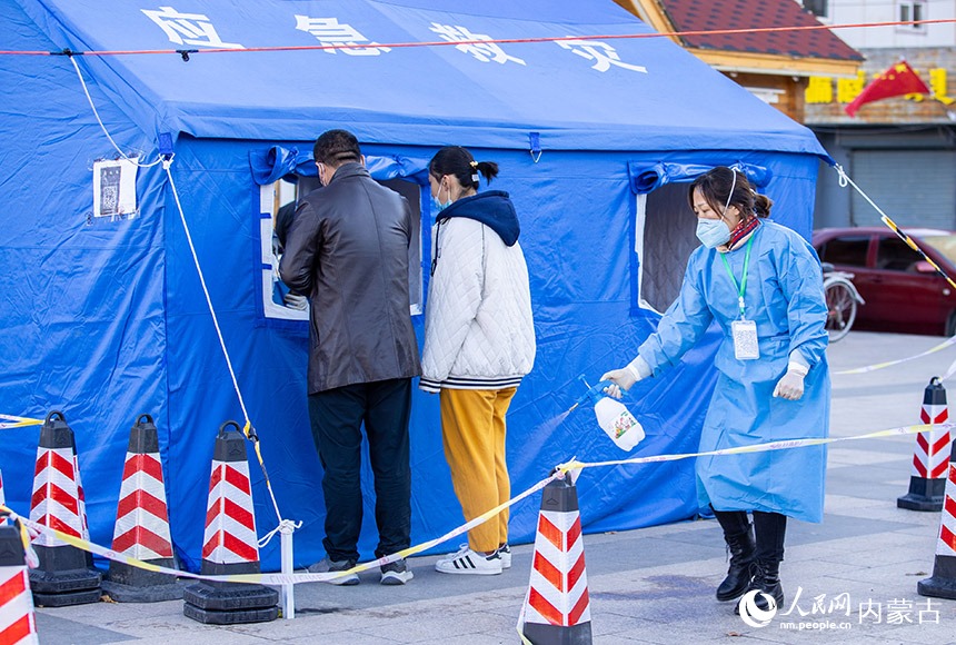 呼和浩特市玉泉區(qū)一處核酸篩查點,黨員志愿者對核酸采樣通道進(jìn)行消殺。丁根厚攝